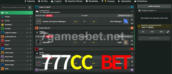 O 777CC Bet oferece uma grande seleção de opções de apostas em e-sports com probabilidades competitivas